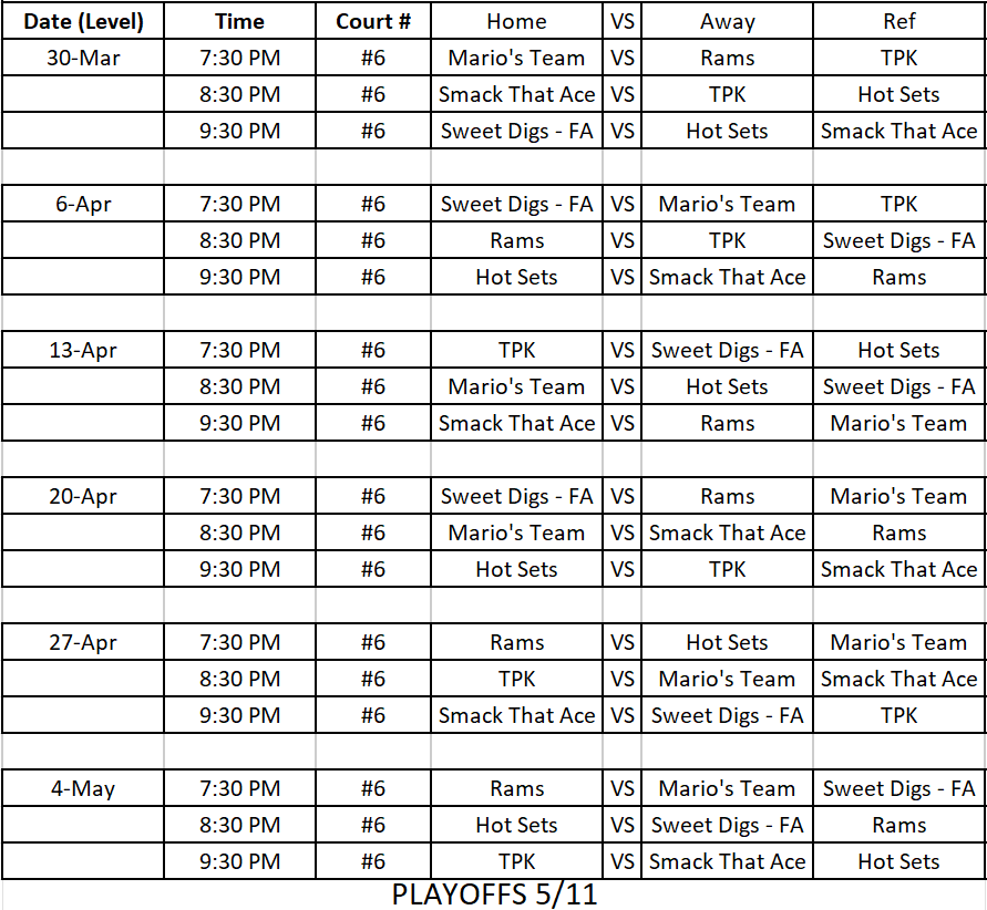 2026 Monday Indoor 6’s Spring Season Schedule