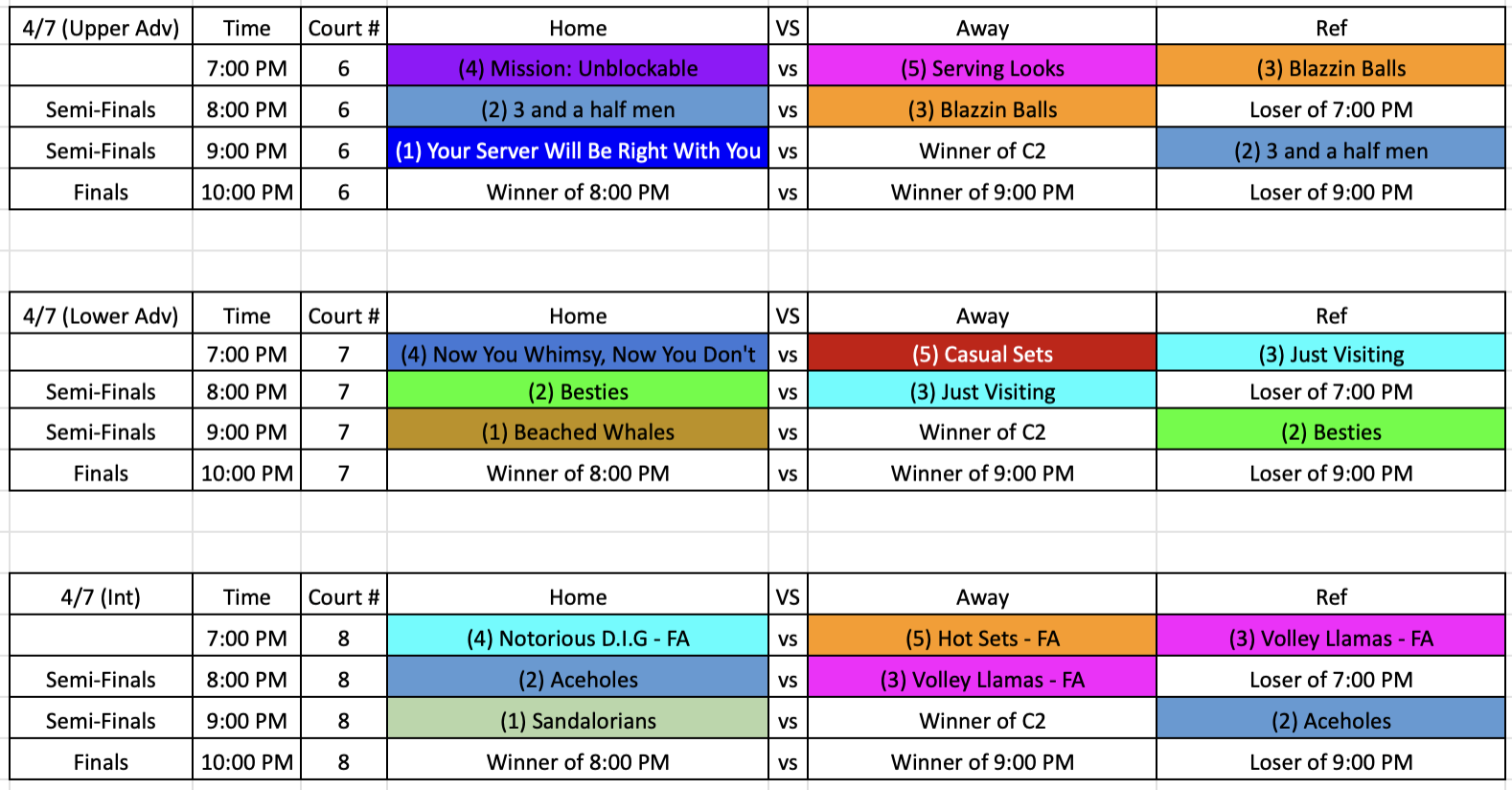 2026 Tuesday Sand 4’s Spring Playoff Schedule