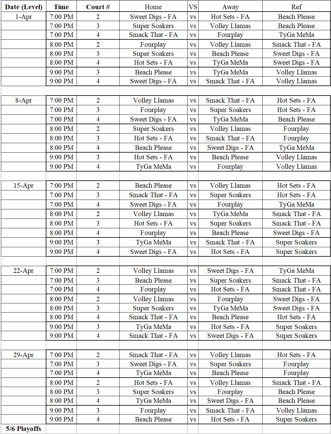 Rules: Most of the rules have been posted in our Sand Rules section on website, but for this league there will not be open hand receive, no open hand dinks. Doubles won’t be called and pushing over requires shoulders to be squared to where it is going.
